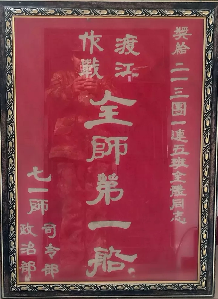 傳家寶描述:1949年4月21日,渡江戰(zhàn)役打響,原71師213團1連在兄弟單位配合下,偷襲和強攻相結合,一舉殲滅7個連,攻占了營渡峽口的跳板——太陽洲,在所有進攻分隊中,一連五班最先抵達長江南岸,成為全師渡江戰(zhàn)役中最英勇的一支分隊,五班因此被師授予“渡江第一船”稱號。
