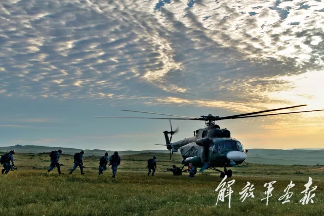 擔(dān)負(fù)機(jī)降任務(wù)的藍(lán)軍旅官兵迅速登機(jī)。
