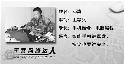 現(xiàn)在,鄧濤“手機(jī)管家”的名聲早已打響,團(tuán)里打算為他和幾位有同樣特長的官兵成立業(yè)余工作室,一方面嘗試開發(fā)適合軍營的智能手機(jī)APP,一方面為戰(zhàn)友們提供手機(jī)維修服務(wù)。別看鄧濤只是個上等兵,因?yàn)榧夹g(shù)出眾,他已被大家推舉成了工作室的室長了。
