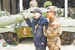 錢建民(左一)在部隊官兵的攙扶下摸了坦克。張文舉 攝