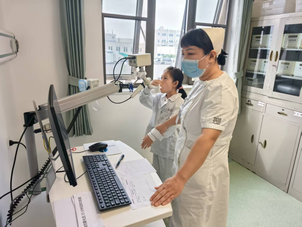 醫(yī)護人員引導(dǎo)患兒進行肺功能檢查。醫(yī)院供圖