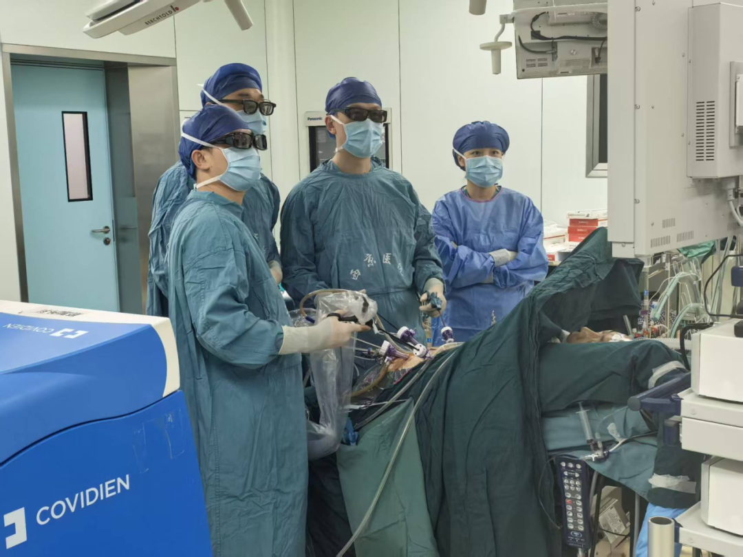 手術(shù)正式開始,由楊詔旭教授主刀,彭偉等醫(yī)師擔(dān)任助手。和之前預(yù)想的一樣,腔鏡下腹腔粘連嚴(yán)重,分離過程中采用先易后難,層層遞進(jìn)方式,抽絲剝繭一般剝離粘連組織,精準(zhǔn)操作同時還要保護(hù)好重要血管,任何細(xì)微操作容不得一絲失誤。在3D腹腔鏡放大視野下,手術(shù)團(tuán)隊?wèi){借熟練的腔鏡技巧及默契配合,開啟了這場精細(xì)的極限操作。