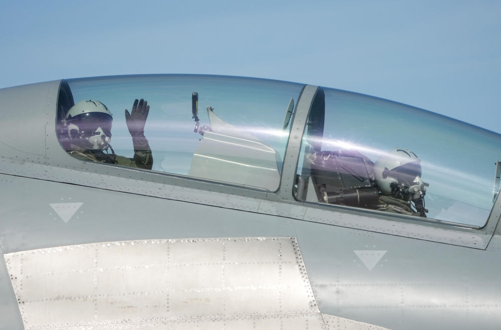 ↑9月19日,殲-16飛行員在完成表演后向觀眾揮手致意。新華社記者 顏麟蘊 攝