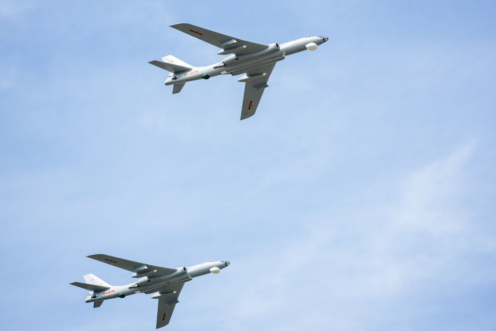 ↑9月19日,轟-6雙機編隊進(jìn)行飛行展示。新華社記者 張楠 攝