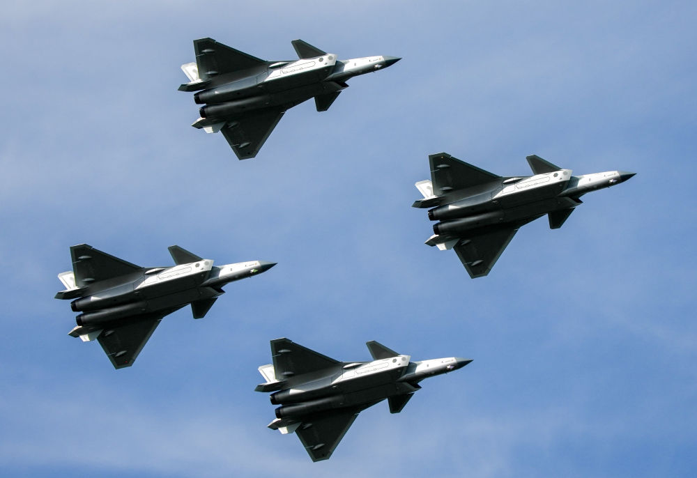 ↑9月19日,殲-20四機編隊進(jìn)行機動飛行展示。新華社記者 顏麟蘊 攝