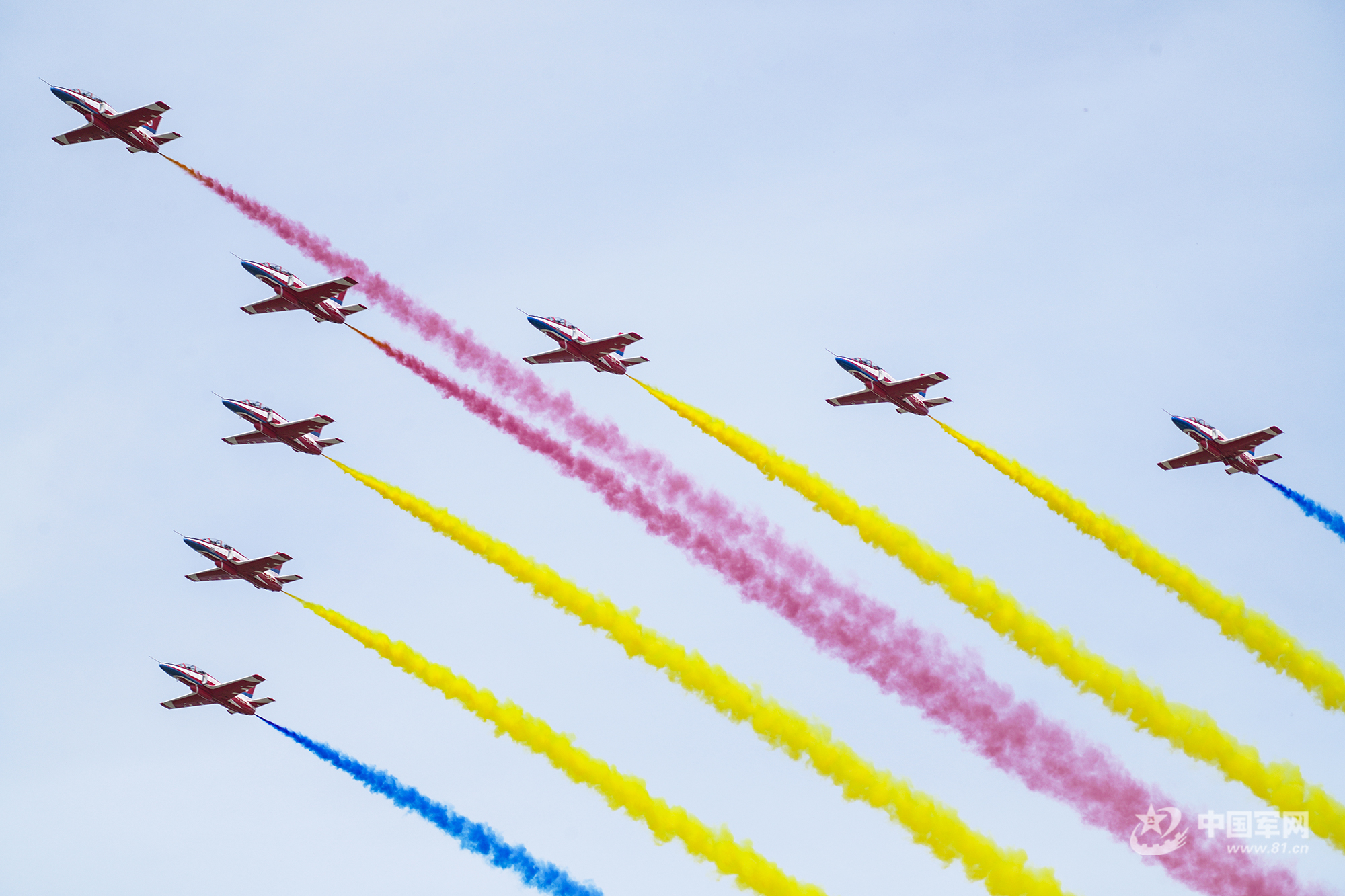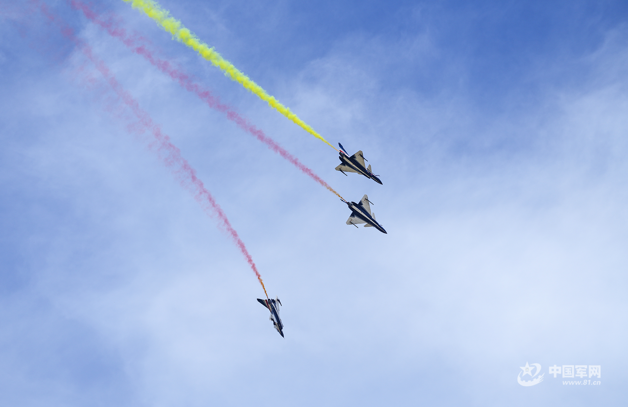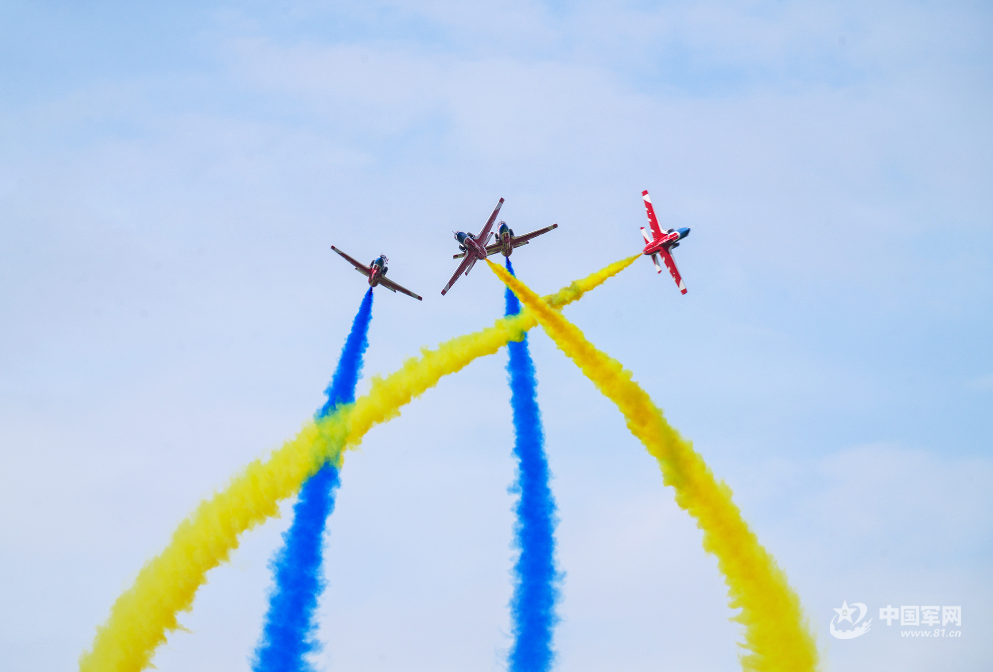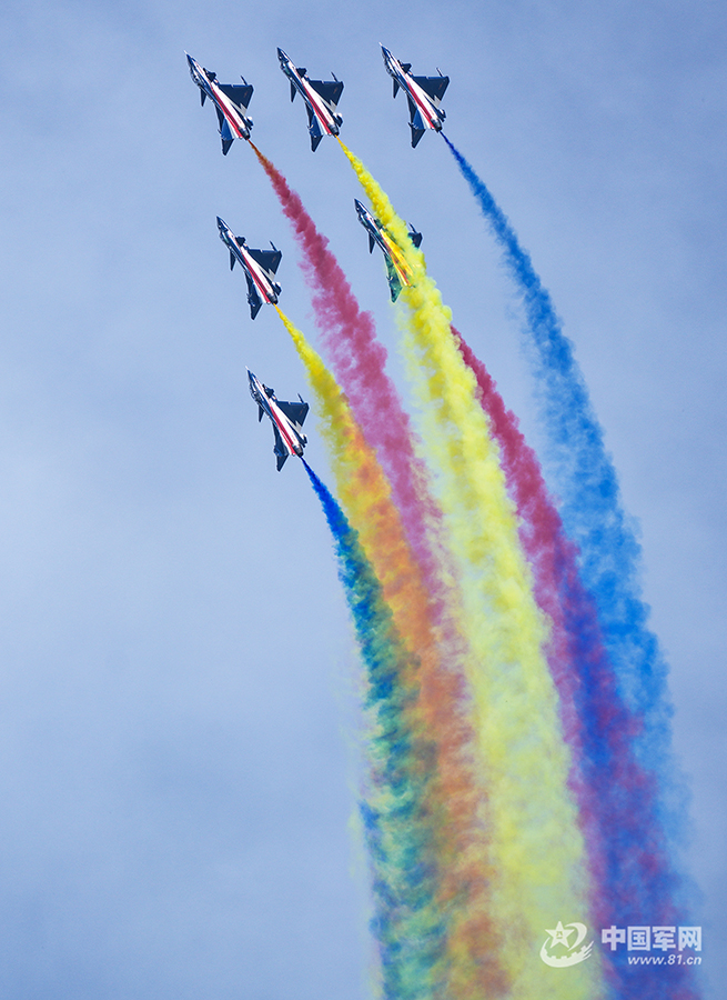 八一飛行表演隊紅黃藍彩煙劃過天際