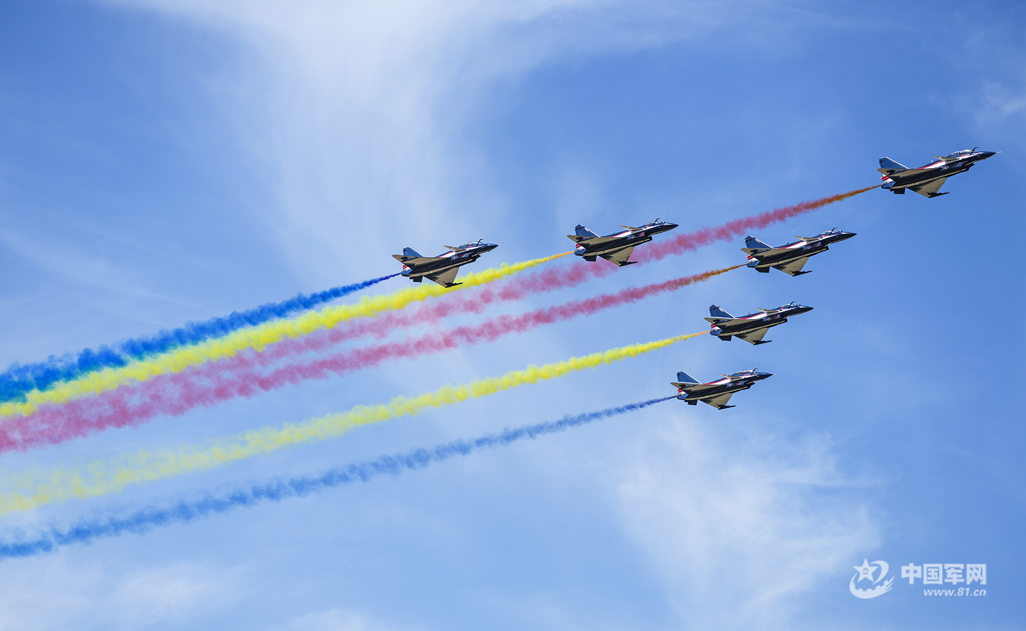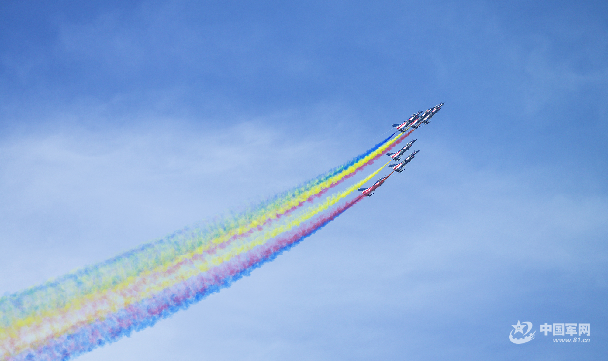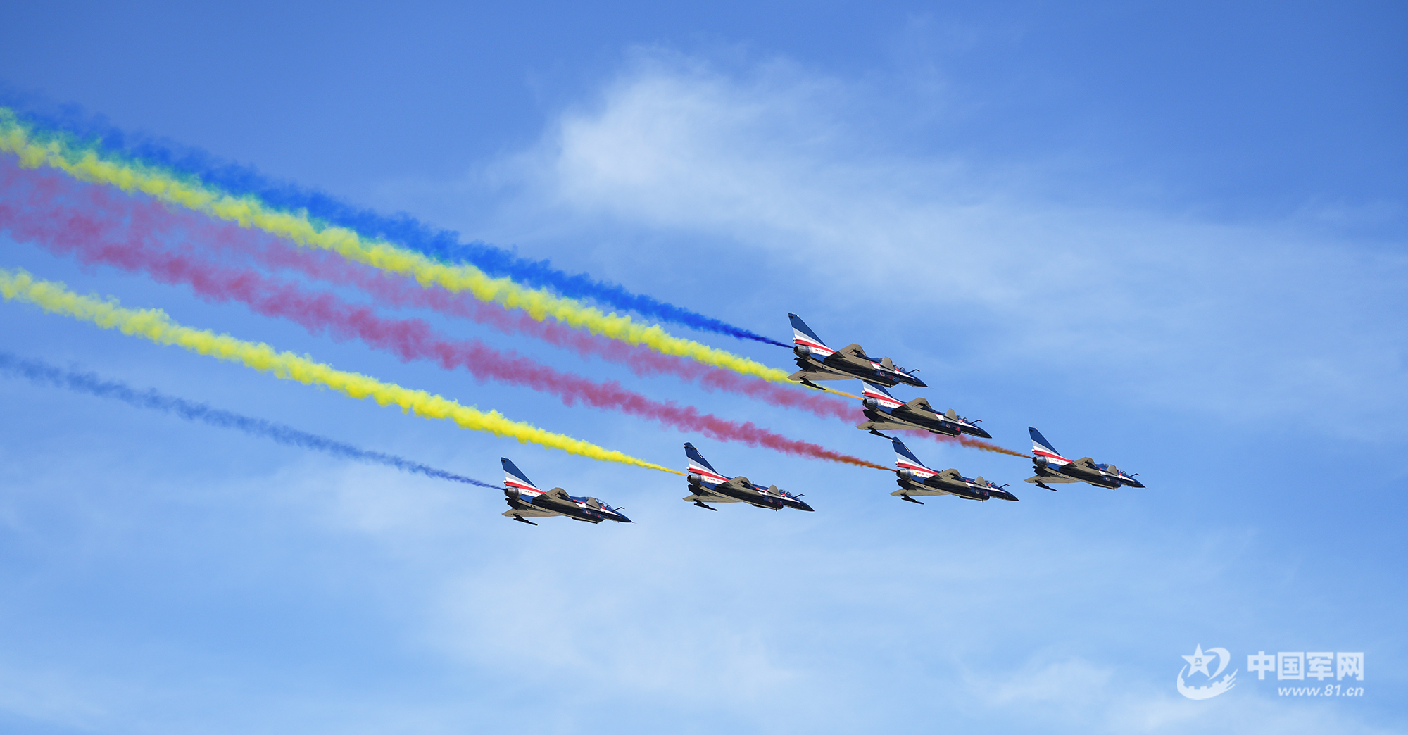 八一飛行表演隊紅黃藍彩煙劃過天際
