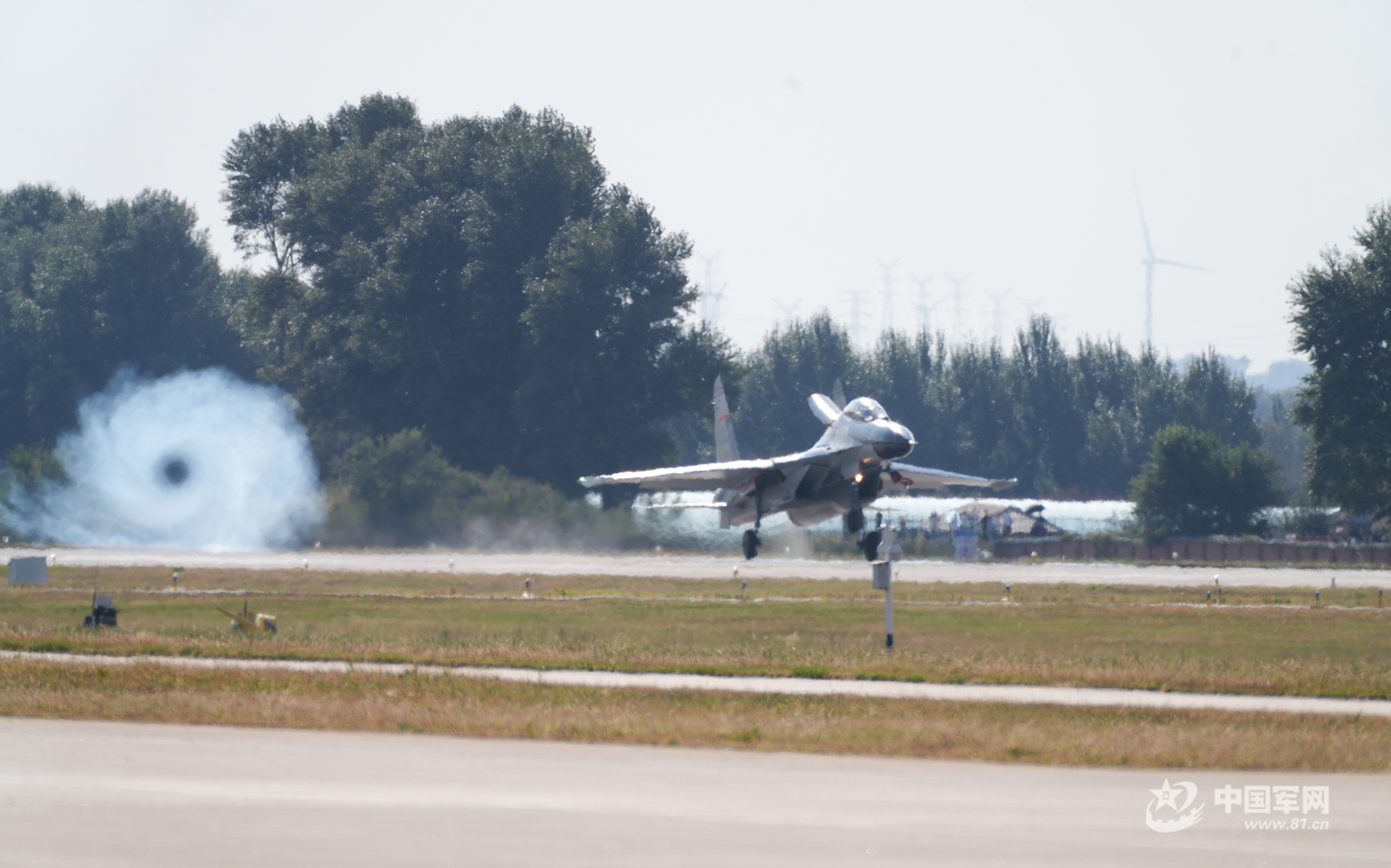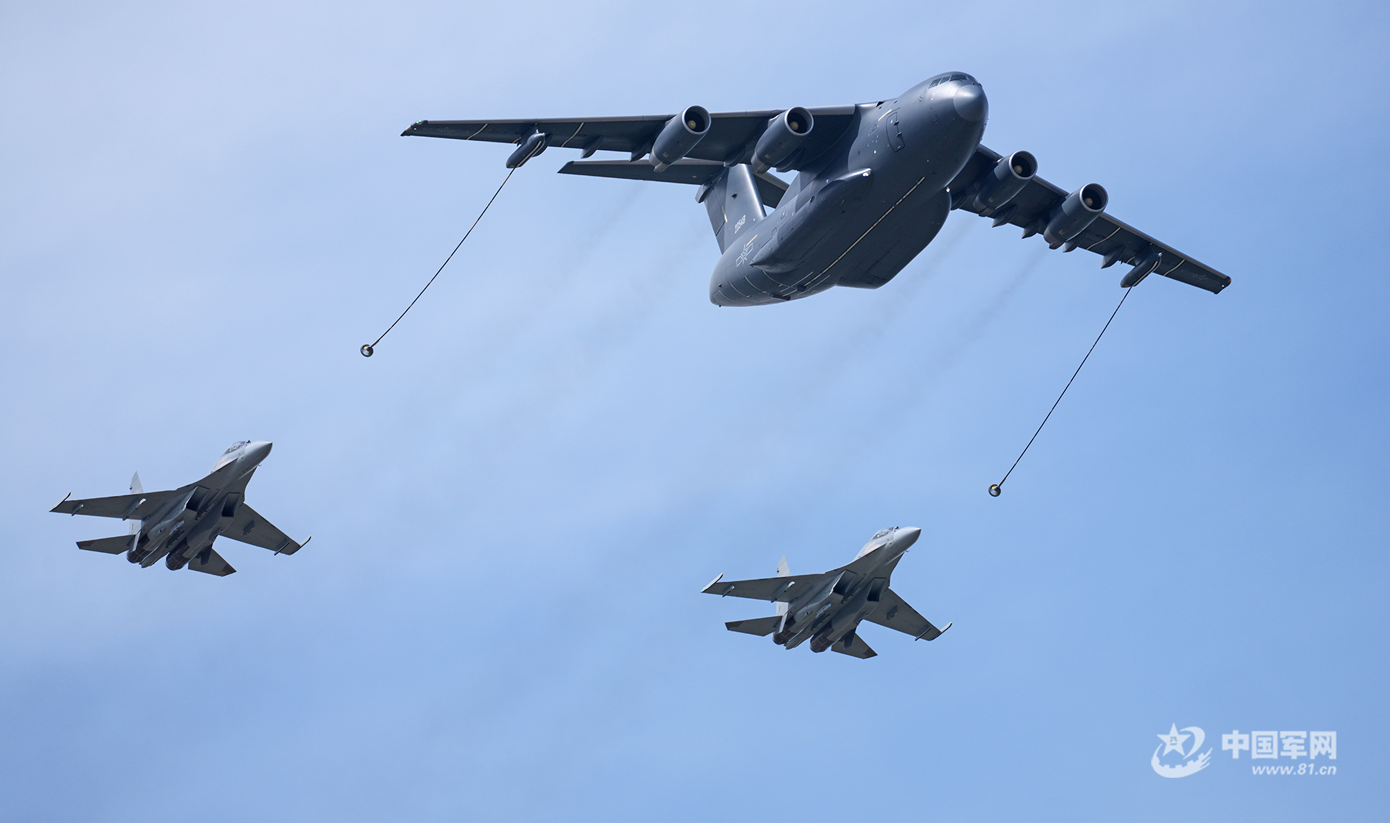 運油-20A單機和殲-16雙機加油編隊通場