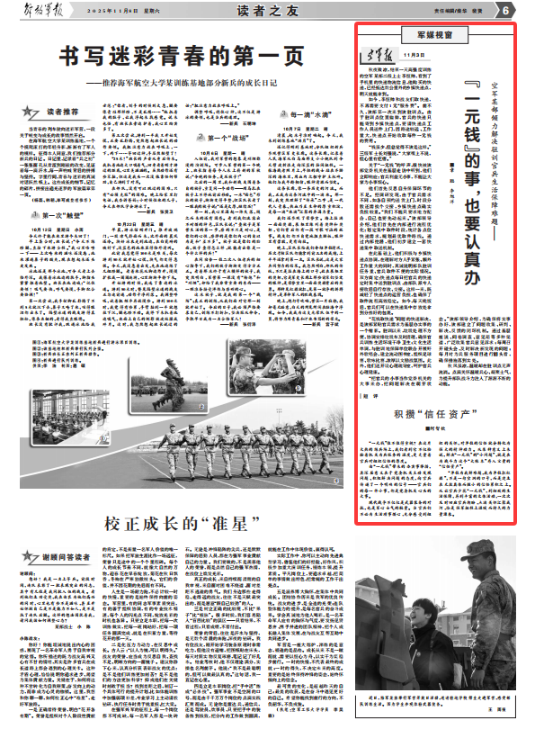 由“一元錢”帶來的辦實事舉措,其深層意義在于黨委機(jī)關(guān)主動發(fā)現(xiàn)問題、積極解決問題的態(tài)度,向官兵傳遞了一個明確的信號——官兵們的每一件小事,都是黨委機(jī)關(guān)心頭的大事。
