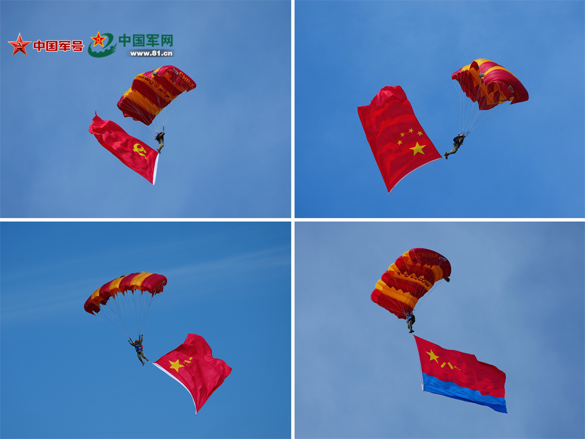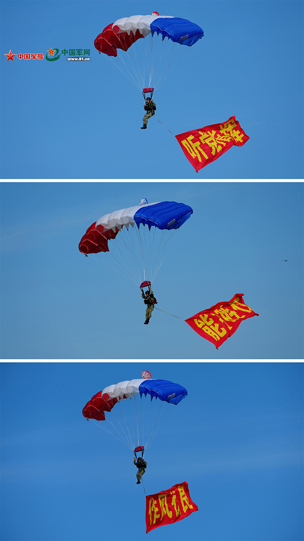 9月19日上午,第十一屆空軍航空開放活動和長春航空展在吉林長春開幕。這是跳傘隊(duì)攜帶黨旗、國旗、八一軍旗和空軍軍旗先后躍出機(jī)艙。中國軍網(wǎng)記者孫悅 攝