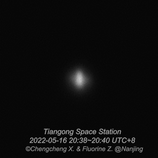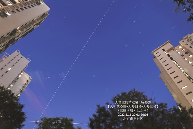 5月16日,中國空間站過境南京,天舟四號(hào)與核心艙、天舟三號(hào)組成“一”字構(gòu)型。(徐成城、朱一靜 提供)