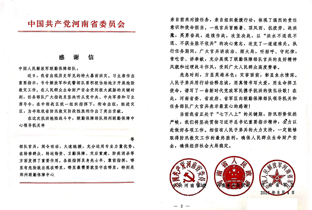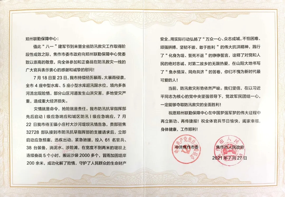 8月份以來(lái),聯(lián)勤保障部隊(duì)機(jī)關(guān)和中心本級(jí)先后收到了河南省委、省政府、省軍區(qū)聯(lián)名,鄭州市委、市政府等軍地單位發(fā)來(lái)的感謝信、榮譽(yù)證書(shū)、錦旗,表達(dá)了對(duì)中心機(jī)關(guān)和任務(wù)部隊(duì)的衷心感謝。