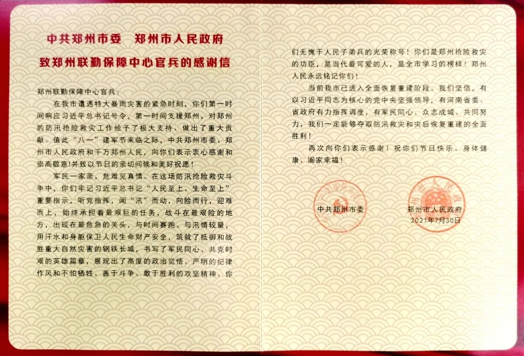 鄭州市委、市政府發(fā)來(lái)感謝信