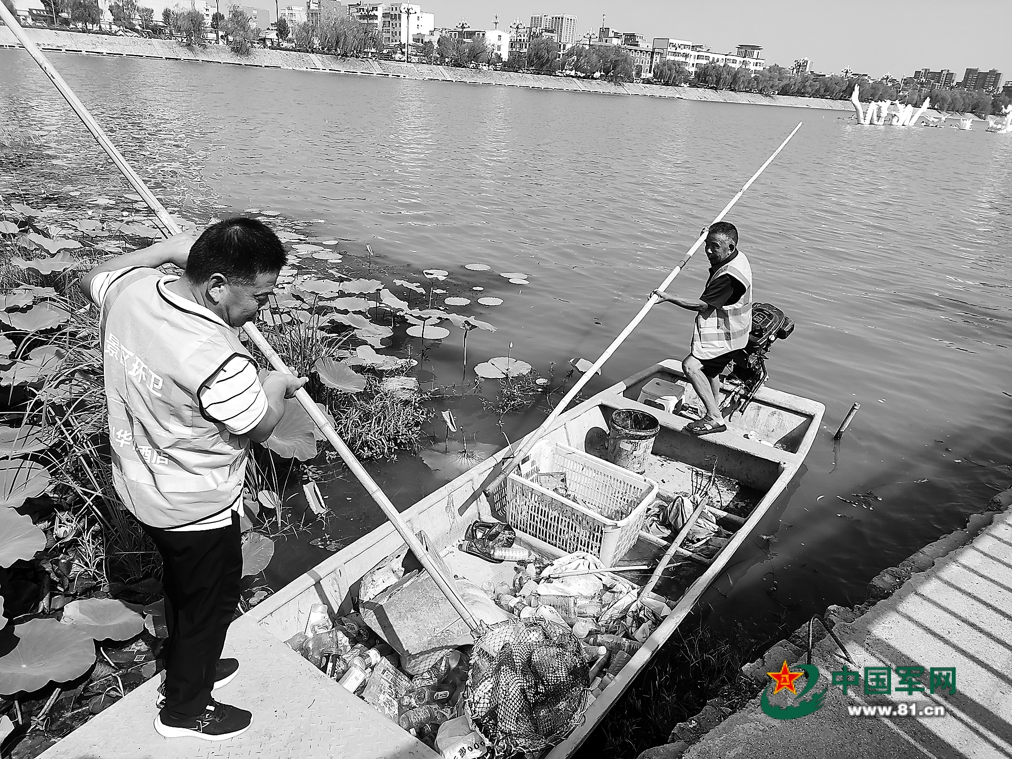 一艘藍(lán)色打撈船劃破平靜的水面,向荷塘深處駛?cè)?。一位身穿藍(lán)色工裝馬甲、皮膚黝黑的中年人站在船頭,來到一處漂浮物聚集點(diǎn)。只見他身體微微前傾,抄起鐵制撈網(wǎng)向水面一伸、一舀,又猛地一翻,便將水面上枯萎的荷葉、雜物等收入船艙中。