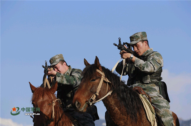 新疆軍區(qū)紅海溝邊防連巡邏官兵馬上戰(zhàn)術(shù)動作。特約記者阿丑攝