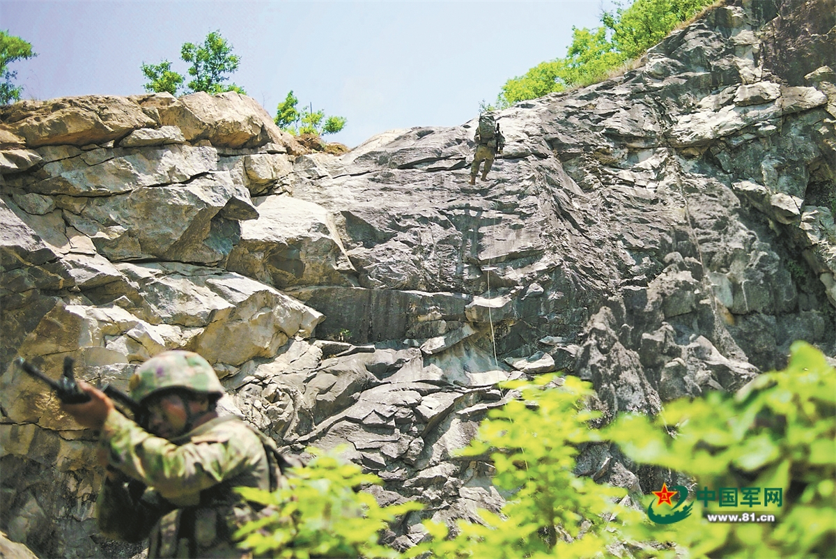 然而,偵察小隊沒有遲疑。在指揮員劉祖博指揮下,偵察小隊很快行動起來。抓握繩索、腳踩巖點、身體貼近巖壁,每個人的動作都很流暢,很快通過了陡崖。
