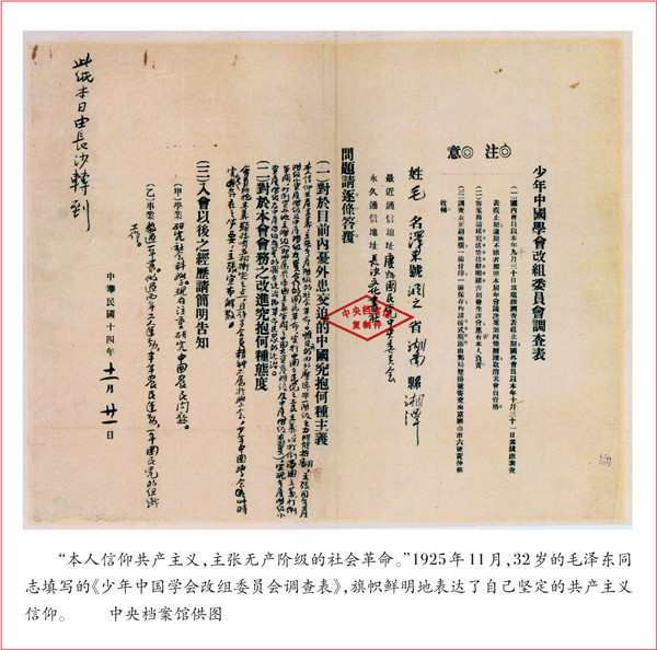 ——“毛澤東同志在青年時(shí)期就立下拯救民族于危難的遠(yuǎn)大志向……十月革命一聲炮響,給中國(guó)送來了馬克思列寧主義。從紛然雜陳的各種觀點(diǎn)和路徑中,經(jīng)過反復(fù)比較和鑒別,毛澤東同志毅然選擇了馬克思列寧主義,選擇了為實(shí)現(xiàn)共產(chǎn)主義而奮斗的崇高理想。在此后的革命生涯中,不管是‘倒海翻江卷巨瀾’,還是‘雄關(guān)漫道真如鐵’,毛澤東同志始終都矢志不移、執(zhí)著追求。”