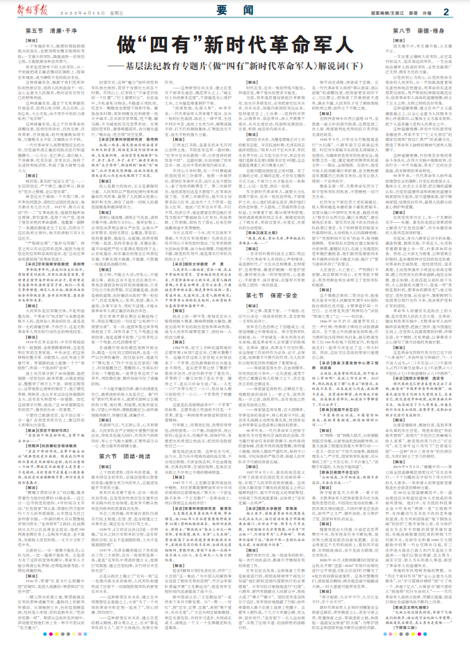 做“四有”新時代革命軍人,就要把德作為立身之本、成才之基,保持艱苦奮斗本色,培養(yǎng)健康生活情趣,堅守真理、堅守正道、堅守原則、堅守規(guī)矩,踐行社會公德、職業(yè)道德、家庭美德、個人品德,矢志追求更有高度、更有境界、更有品位的人生。