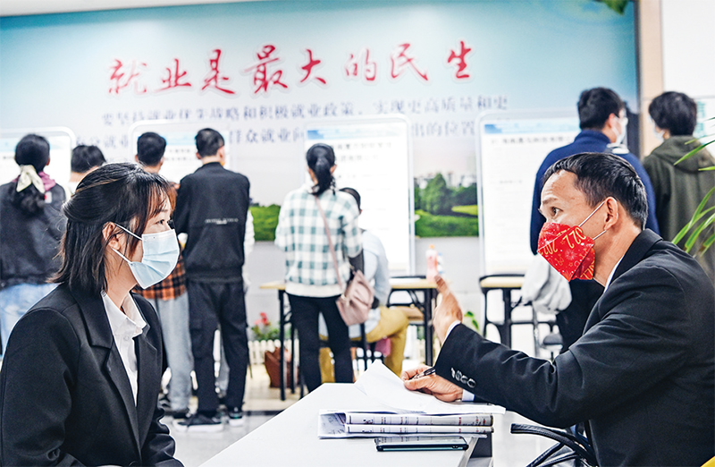 我國強(qiáng)化就業(yè)優(yōu)先政策,繼續(xù)做好高校畢業(yè)生、農(nóng)民工等重點(diǎn)群體和困難群體就業(yè)幫扶,促進(jìn)市場化社會化就業(yè)。圖為2022年3月9日,海南自由貿(mào)易港招才引智活動暨“揚(yáng)帆自貿(mào),圓夢??凇?022屆高校畢業(yè)生專場招聘會現(xiàn)場,當(dāng)天近60家企業(yè)參會,提供1400余個崗位,涉及建造師、機(jī)械工程師、財務(wù)、行政等優(yōu)質(zhì)崗位。 人民圖片 張俊其/攝