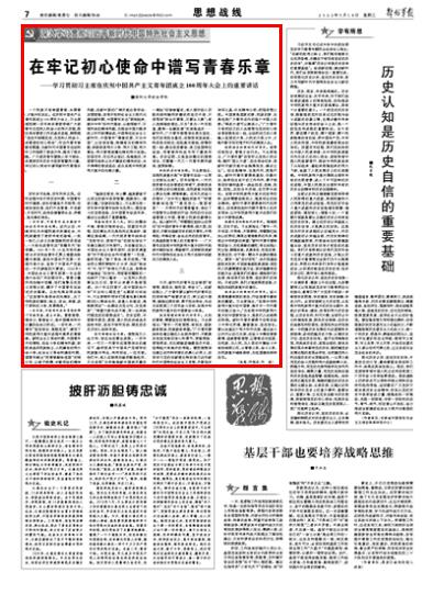 一個(gè)民族只有寄望青春、永葆青春,才能興旺發(fā)達(dá)。在慶祝中國(guó)共產(chǎn)主義青年團(tuán)成立100周年大會(huì)上,習(xí)主席全面回顧一百年來(lái)共青團(tuán)帶領(lǐng)廣大團(tuán)員青年為黨和人民奮斗的偉大歷程,深刻總結(jié)共青團(tuán)工作的基本經(jīng)驗(yàn),鮮明提出“堅(jiān)定不移跟黨走,為黨和人民奮斗,是共青團(tuán)的初心使命”,對(duì)當(dāng)代青年寄予殷切期望,為新時(shí)代中國(guó)青年運(yùn)動(dòng)和青年工作指明了前進(jìn)方向、提供了根本遵循。廣大團(tuán)員青年要深入學(xué)習(xí)領(lǐng)會(huì),從共青團(tuán)百年歷史中汲取智慧和力量,在牢記初心使命中譜寫新時(shí)代青春樂(lè)章。