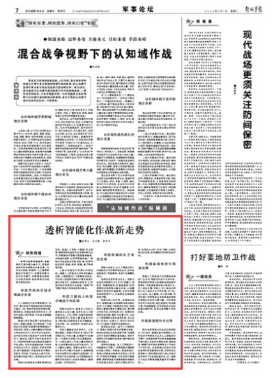 ●現(xiàn)代戰(zhàn)爭(zhēng)實(shí)踐證明,高新科技已成為核心戰(zhàn)斗力,并推動(dòng)戰(zhàn)爭(zhēng)形態(tài)向智能化快速邁進(jìn)。尤其在大數(shù)據(jù)、物聯(lián)網(wǎng)、人工智能等新技術(shù)的牽引下,在算法和算力技術(shù)的支撐下,軍事智能化程度正在逐步加深,戰(zhàn)場(chǎng)智能化作戰(zhàn)特點(diǎn)越發(fā)顯現(xiàn)。