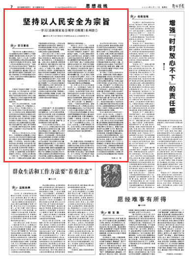 人民安全高于一切,是總體國家安全觀的精髓所在。習(xí)主席關(guān)于人民安全的重要論述,從歷史與現(xiàn)實(shí)相貫通、治標(biāo)與治本相關(guān)聯(lián)、當(dāng)前與長遠(yuǎn)相統(tǒng)籌的寬廣視角,系統(tǒng)回答了如何認(rèn)識人民安全、如何做好人民安全工作等重大理論和現(xiàn)實(shí)問題,內(nèi)容豐富、邏輯嚴(yán)密,必須長期堅(jiān)持并不斷豐富發(fā)展。