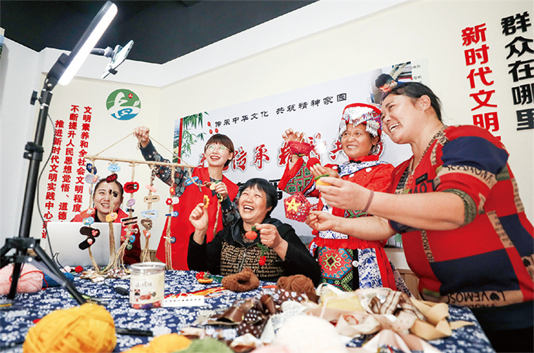 2021年10月27日,浙江省湖州市長興縣虹星橋鎮(zhèn)畢家村在新時(shí)代文明實(shí)踐站開展“文化傳承,精神共富”直播帶貨活動(dòng)。該村以“黨建+”的形式,帶領(lǐng)村民一起制作手工藝品,學(xué)習(xí)電商、直播等線上營銷網(wǎng)絡(luò)新技能,提升村民就業(yè)技能,助力共同富裕。圖為青年黨員志愿者和村民一起直播帶貨?!∏笫菆D片 陸一平/攝