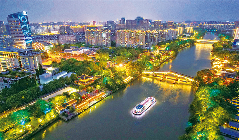 浙江省全面加強(qiáng)京杭大運(yùn)河杭州段人文景觀建設(shè),打造集文化、旅游、健身等功能于一體的市民樂(lè)園。圖為2022年7月15日拍攝的“漢宮”號(hào)游船緩緩駛過(guò)京杭大運(yùn)河拱宸橋段?!≌憬∥麄鞑抗﹫D 董旭明 鮑圣慧/攝