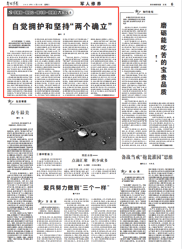 行源于心,力源于志。只有理論上徹底學(xué)懂弄通,政治上才會更加堅(jiān)定,行動上才會更加自覺。擁護(hù)和堅(jiān)持“兩個確立”,必須堅(jiān)持不懈用習(xí)近平新時代中國特色社會主義思想武裝頭腦,在培塑政治忠誠、掌握思想方法、破解發(fā)展難題上見成效。學(xué)之愈深,知之愈明,信之愈真。軍隊(duì)黨員干部應(yīng)帶頭多讀原著、勤學(xué)原文、深悟原理,切實(shí)領(lǐng)會其中精髓,努力掌握實(shí)踐指南,做到在面對各種矛盾問題和重大風(fēng)險(xiǎn)挑戰(zhàn)時,方向明確、頭腦清醒、應(yīng)對有方、行動有力。列寧指出:“沒有人的情感,就從來沒有也不可能有人對于真理的追求?!秉h的理論創(chuàng)新和實(shí)踐創(chuàng)新是生動的,我們的學(xué)習(xí)也應(yīng)該是生動的。要聯(lián)系這些年來我們走過的極不尋常、極不平凡的歷程,聯(lián)系改革強(qiáng)軍的生動實(shí)踐,自覺融入“學(xué)習(xí)強(qiáng)軍思想、建功強(qiáng)軍事業(yè)”教育實(shí)踐活動,多形式多渠道展現(xiàn)黨的創(chuàng)新理論的真理力量、精神力量、實(shí)踐力量。