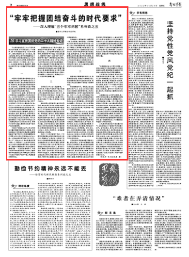 習主席在參加黨的二十大廣西代表團討論時強調(diào),學習貫徹黨的二十大精神,要“牢牢把握團結(jié)奮斗的時代要求”。團結(jié)才能勝利,奮斗才會成功。踏上新征程,我們必須牢牢把握團結(jié)奮斗的時代要求,更加緊密團結(jié)在以習近平同志為核心的黨中央周圍,把思想和行動統(tǒng)一到黨的二十大精神上來,萬眾一心、眾志成城,踔厲奮發(fā)、勇毅前行,凝聚起以新的偉大奮斗創(chuàng)造新的偉業(yè)的蓬勃力量。
