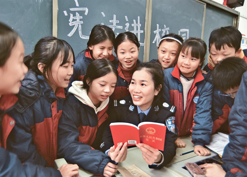 在習(xí)近平法治思想指引下,新時(shí)代十年我們黨全面加強(qiáng)憲法實(shí)施和監(jiān)督,設(shè)立了全國人大憲法和法律委員會(huì),建立憲法宣誓制度,設(shè)立國家憲法日。圖為2022年12月4日,第九個(gè)“國家憲法日”活動(dòng)當(dāng)天,湖南省郴州市嘉禾縣司法局開展“憲法知識(shí)進(jìn)校園”活動(dòng),司法工作人員在博雅學(xué)校向?qū)W生講解憲法知識(shí)?!∪嗣駡D片供圖