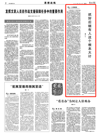 習主席在黨的二十大報告中強調(diào)指出:“抓好后繼有人這個根本大計,健全培養(yǎng)選拔優(yōu)秀年輕干部常態(tài)化工作機制,把到基層和艱苦地區(qū)鍛煉成長作為年輕干部培養(yǎng)的重要途徑?!睆娷娭?,要在得人。對人民軍隊來說,人才是贏得軍事競爭主動和未來戰(zhàn)爭的關鍵因素。貫徹落實習主席重要指示精神,如期實現(xiàn)建軍一百年奮斗目標,加快把人民軍隊建成世界一流軍隊,要求我們牢固樹立人才是第一資源的強烈意識,全面實施新時代人才強軍戰(zhàn)略,持續(xù)不斷培養(yǎng)造就堪當強軍重任的高素質(zhì)專業(yè)化新型軍事人才。