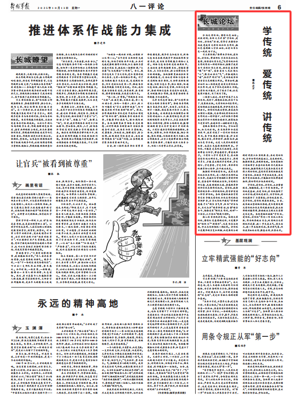 學(xué)傳統(tǒng)、愛(ài)傳統(tǒng)、講傳統(tǒng),三者緊密聯(lián)系、相輔相成,是一個(gè)有機(jī)整體。學(xué)傳統(tǒng)是基礎(chǔ),為愛(ài)傳統(tǒng)、講傳統(tǒng)指明了正確方向;愛(ài)傳統(tǒng)是動(dòng)力,為學(xué)傳統(tǒng)、講傳統(tǒng)提供了力量源泉;講傳統(tǒng)是路徑,是學(xué)傳統(tǒng)、愛(ài)傳統(tǒng)的具體實(shí)踐。當(dāng)前,我軍政治整訓(xùn)縱深推進(jìn),更加需要發(fā)揮光榮傳統(tǒng)和優(yōu)良作風(fēng)激濁揚(yáng)清、扶正祛邪的功能作用,推動(dòng)政治上的正本清源走深走實(shí)。各級(jí)黨組織應(yīng)把“學(xué)傳統(tǒng)、愛(ài)傳統(tǒng)、講傳統(tǒng)”作為一項(xiàng)系統(tǒng)工程來(lái)抓,作為純凈政治生態(tài)、鞏固純潔光榮的銳利武器,進(jìn)一步充盈正氣、固本培元,進(jìn)一步立起新風(fēng)尚、展示新氣象,確保我軍血脈永續(xù)、根基永固、優(yōu)勢(shì)永存。