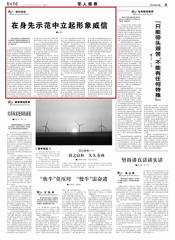 ●立起好樣子,展現(xiàn)新風貌,每名政治干部都要堅持做在前、干在先,以過硬作風和形象感召部隊、帶動官兵