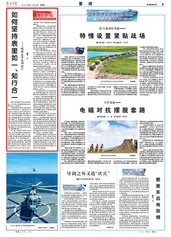 只有保持理論上的清醒,才能保持政治上的堅(jiān)定、行動(dòng)上的堅(jiān)決。堅(jiān)持表里如一、知行合一,重在用黨的創(chuàng)新理論改造主觀世界和客觀世界。黨的創(chuàng)新理論是“定盤星”“指南針”,能使人明辨是非、看清善惡、區(qū)分美丑。黨員干部只有堅(jiān)持不懈用習(xí)近平新時(shí)代中國(guó)特色社會(huì)主義思想凝心鑄魂,突出學(xué)好習(xí)近平強(qiáng)軍思想,做到學(xué)思用貫通、知信行統(tǒng)一,才能從思想上正本清源、固本培元,真正成為對(duì)黨忠誠(chéng)的老實(shí)人、透明人。