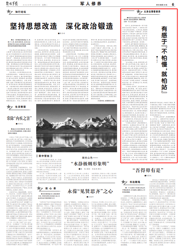 前不久,在某部組織的一場“優(yōu)秀排長交流訪談”活動中,一名排長分享了自己的成長經(jīng)歷。工作之初,他被領(lǐng)導(dǎo)認(rèn)為“不太靠譜”“不夠托底”,后來他奮起努力、不斷進步,最終成長為官兵信服、領(lǐng)導(dǎo)信任的優(yōu)秀排長。他用“不怕慢,就怕站”這句俗語,寄語年輕干部要在基層埋頭苦干、扎實成長,引發(fā)臺下官兵共鳴,也帶給筆者一些思考。