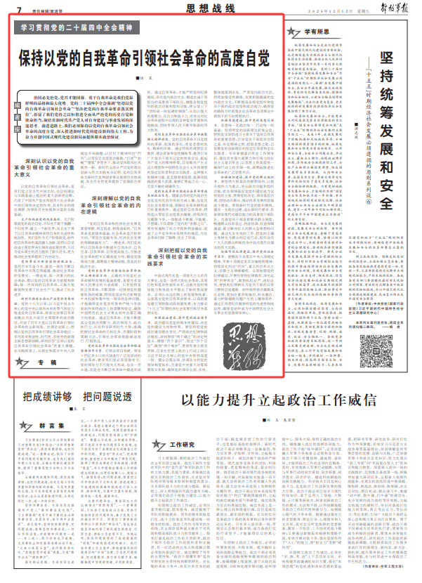 治國必先治黨,黨興才能國強(qiáng)。勇于自我革命是我們黨最鮮明的品格和最大優(yōu)勢。黨的二十屆四中全會強(qiáng)調(diào)“堅(jiān)持以黨的自我革命引領(lǐng)社會革命”“堅(jiān)決把黨的自我革命要求落實(shí)到位”,彰顯了我們黨持之以恒推進(jìn)全面從嚴(yán)治黨的歷史自覺和使命擔(dān)當(dāng),凝結(jié)著新時(shí)代共產(chǎn)黨人對自身建設(shè)與事業(yè)發(fā)展的深邃思考。前進(jìn)道路上,我們必須保持以黨的自我革命引領(lǐng)社會革命的高度自覺,深入推進(jìn)新時(shí)代黨的建設(shè)新的偉大工程,為奮力開創(chuàng)中國式現(xiàn)代化建設(shè)新局面提供根本政治保證。