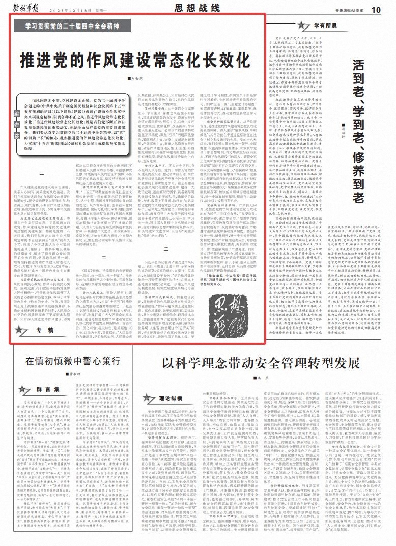作風(fēng)問題無(wú)小事,黨風(fēng)建設(shè)無(wú)止境。黨的二十屆四中全會(huì)通過(guò)的《中共中央關(guān)于制定國(guó)民經(jīng)濟(jì)和社會(huì)發(fā)展第十五個(gè)五年規(guī)劃的建議》(以下簡(jiǎn)稱《建議》)強(qiáng)調(diào):“鍥而不舍落實(shí)中央八項(xiàng)規(guī)定精神,狠剎各種不正之風(fēng),推進(jìn)作風(fēng)建設(shè)常態(tài)化長(zhǎng)效化?!蓖七M(jìn)作風(fēng)建設(shè)常態(tài)化長(zhǎng)效化,既是我們黨不斷開辟自我革命新境界的重要法寶,也是全面從嚴(yán)治黨的重要組成部分。我們要認(rèn)真學(xué)習(xí)貫徹黨的二十屆四中全會(huì)精神,以“常”的韌勁、“長(zhǎng)”的恒心,扎實(shí)推進(jìn)黨的作風(fēng)建設(shè)常態(tài)化長(zhǎng)效化,為實(shí)現(xiàn)“十五五”時(shí)期國(guó)民經(jīng)濟(jì)和社會(huì)發(fā)展目標(biāo)提供堅(jiān)實(shí)作風(fēng)保障。