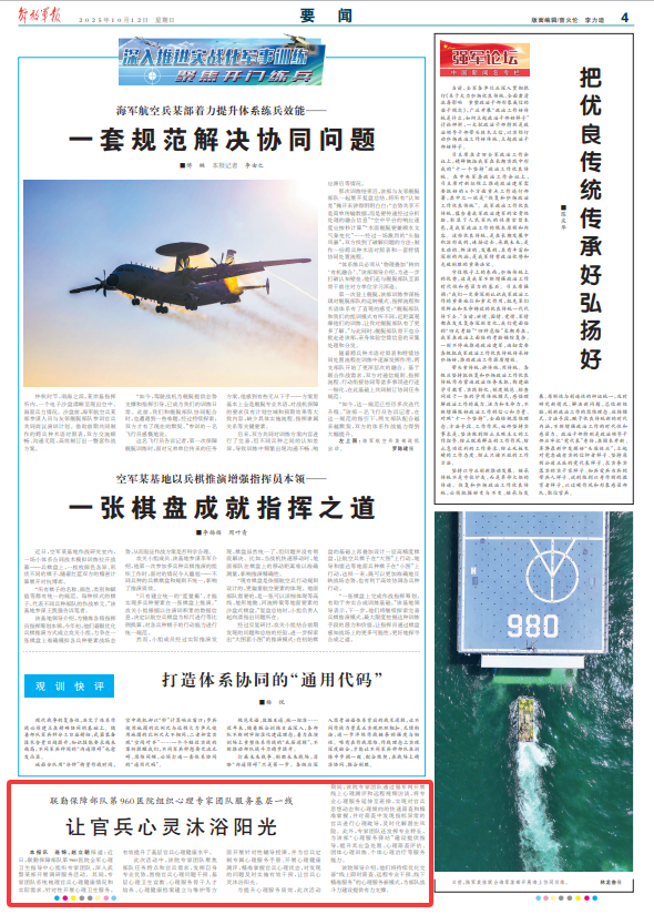 解放軍報(bào)訊 連錦、趙立朝報(bào)道:近日,聯(lián)勤保障部隊(duì)第960醫(yī)院全軍心理衛(wèi)生指導(dǎo)中心組織專家團(tuán)隊(duì),深入武警某部開(kāi)展調(diào)研服務(wù)活動(dòng)。其間,專家團(tuán)隊(duì)系統(tǒng)梳理官兵心理健康情況和實(shí)際需求,針對(duì)性開(kāi)展心理衛(wèi)生服務(wù),有效提升了基層官兵心理健康水平。