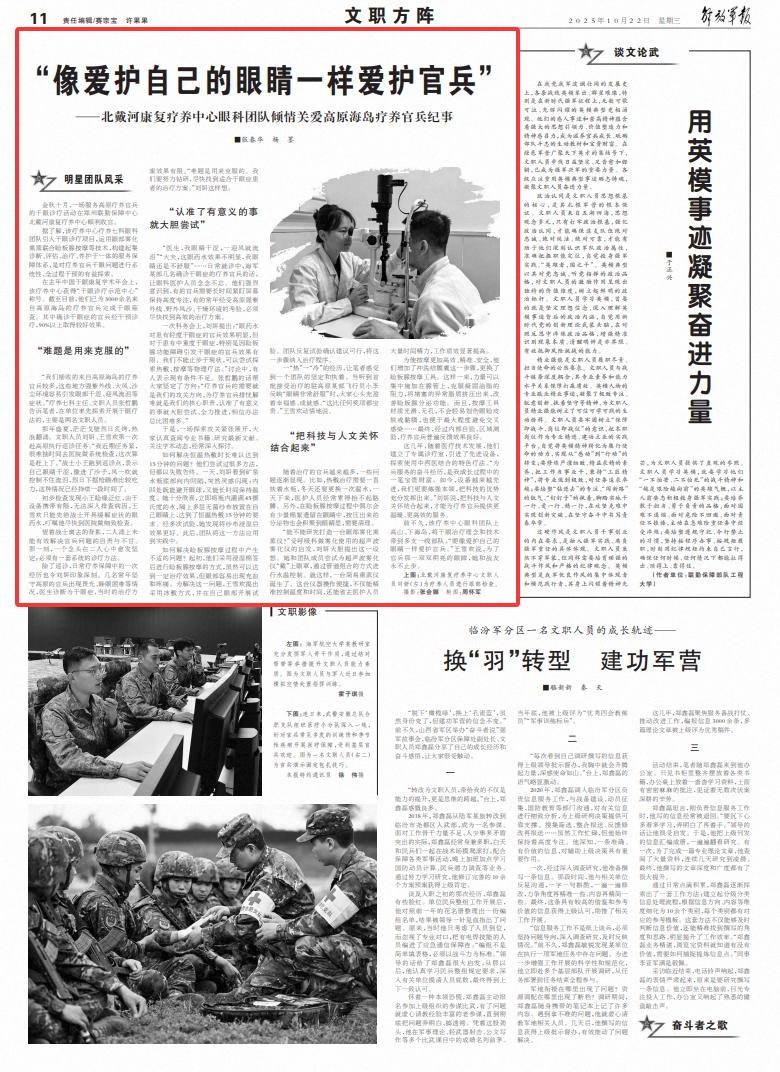 前不久,該療養(yǎng)中心眼科團(tuán)隊(duì)上高山、下海島,將干眼治療理念和技術(shù)帶到多支一線部隊(duì)。“要像愛(ài)護(hù)自己的眼睛一樣愛(ài)護(hù)官兵?!蓖跹g說(shuō),為了官兵那一雙雙明亮的眼眸,她和戰(zhàn)友永不止步。