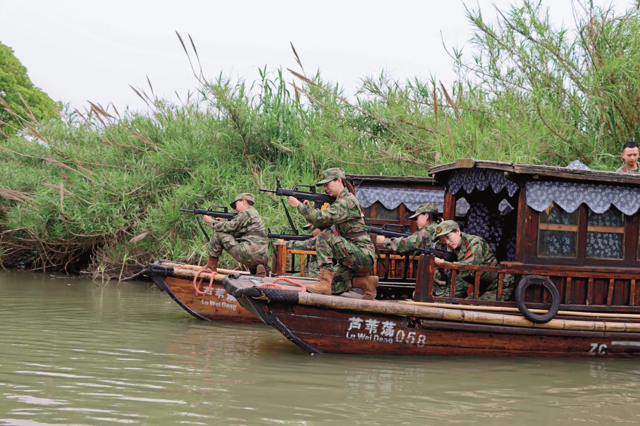 沙家浜女子民兵連組織民兵進(jìn)行水上射擊訓(xùn)練。