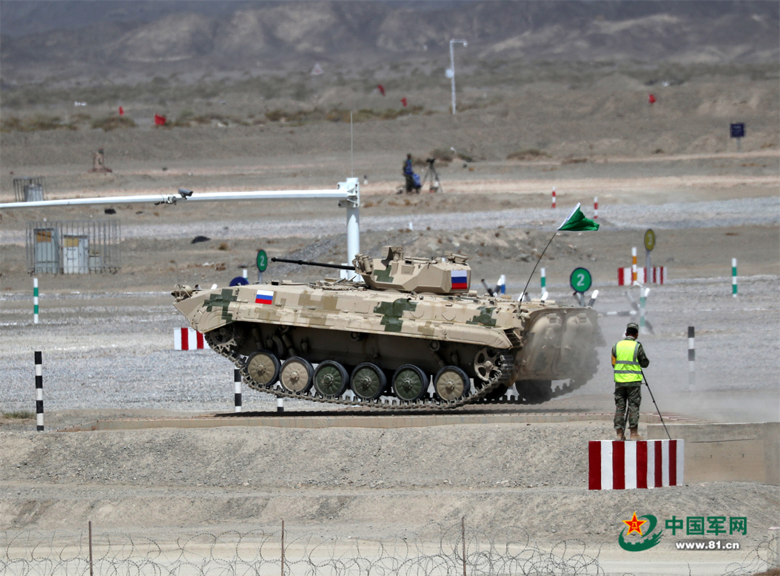 俄羅斯參賽隊駕駛步戰(zhàn)車疾馳在賽道上。羅興倉 攝