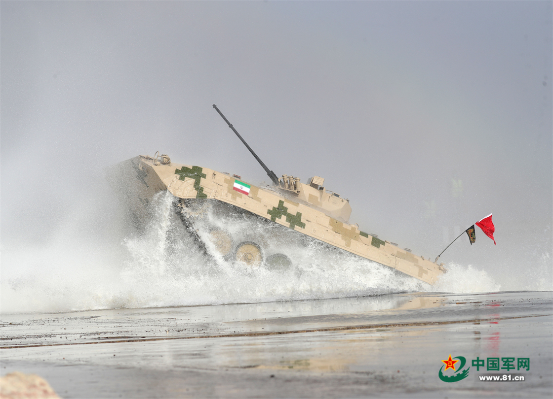 伊朗參賽隊駕駛步戰(zhàn)車通過涉水場。羅興倉 攝
