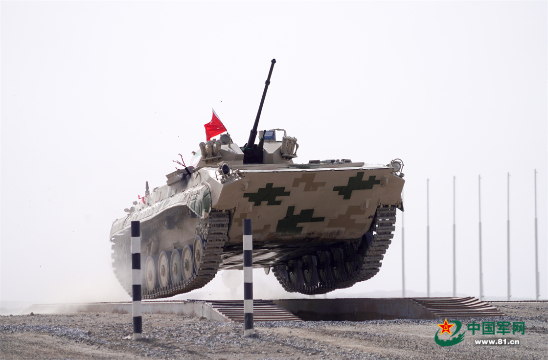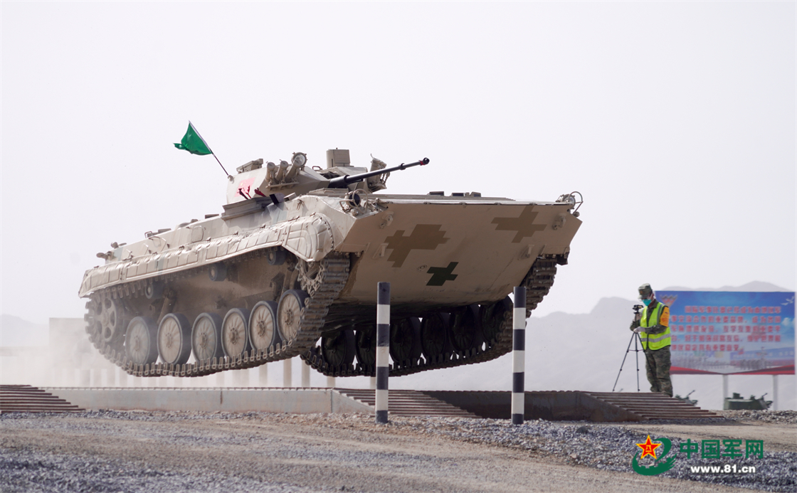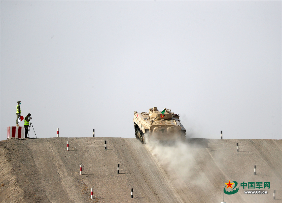 中國參賽隊駕駛步戰(zhàn)車翻越土嶺。羅興倉 攝