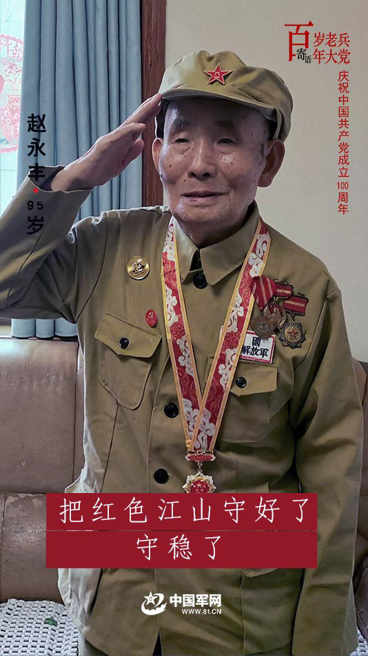 在銻都之鄉(xiāng)——湖南冷水江市錫礦山鄉(xiāng)的革命烈士紀念碑前,今年95歲、白發(fā)蒼蒼的老兵趙永豐,穿著一身老式的軍裝,用他略顯沙啞的聲音高喊道。