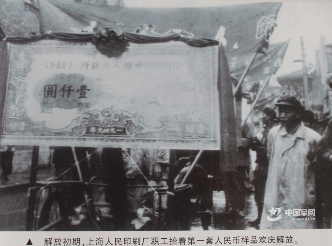 解放初期,上海人民印刷廠職工抬著第一套人民幣樣品歡慶解放。(受訪者供圖)