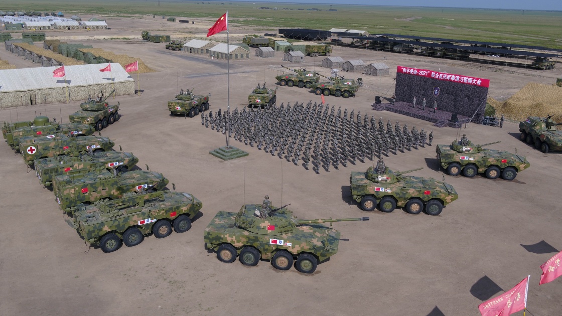參加“和平使命-2021”聯(lián)合軍演的中方參演部隊舉行誓師大會(8月15日攝,無人機照片)。新華社發(fā)(仲崇嶺 攝)
