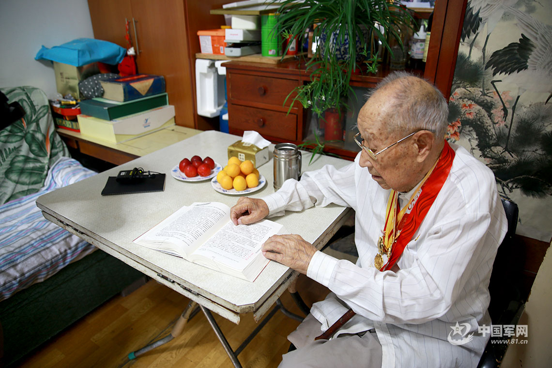 郄志真在看《中國抗日戰(zhàn)爭史》。中國軍網(wǎng)記者 孫智英 攝