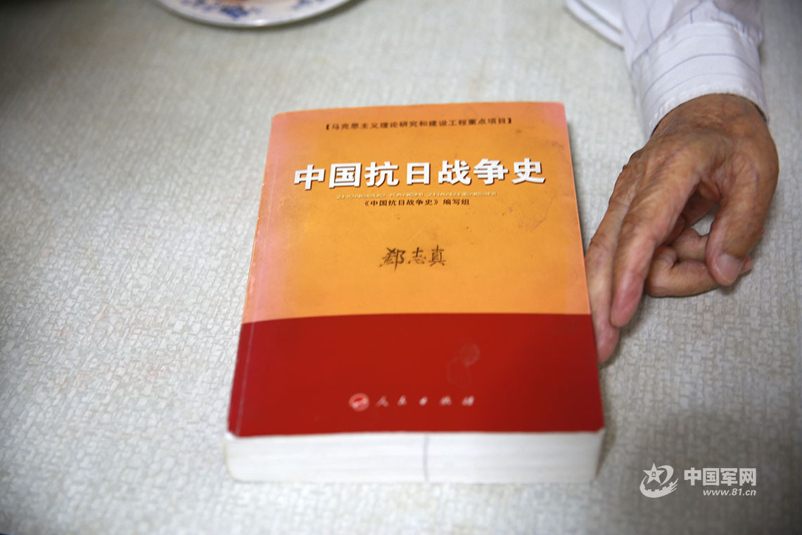 郄志真在看過的《中國抗日戰(zhàn)爭史》上寫上自己的名字。中國軍網(wǎng)記者 孫智英 攝