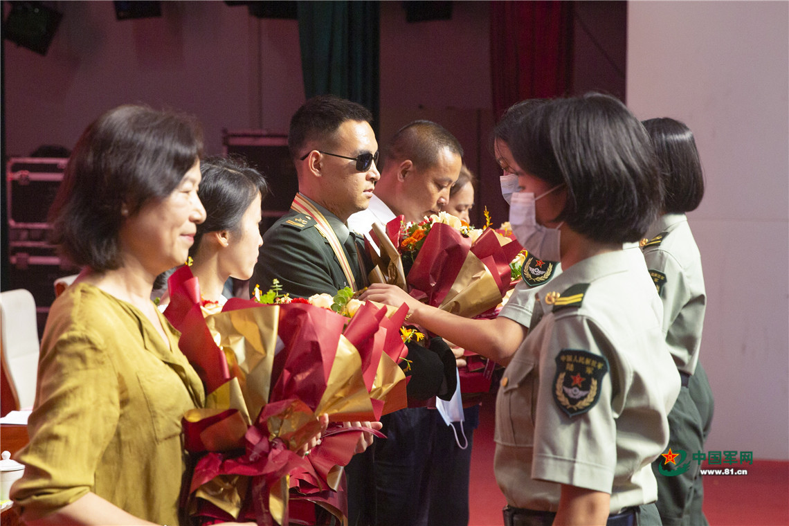 會場內(nèi),氣氛莊重?zé)崃?。伴隨著雄壯嘹亮的軍樂,在熱烈的掌聲中,官兵代表向杜富國同志及其家屬、老師敬獻(xiàn)鮮花。